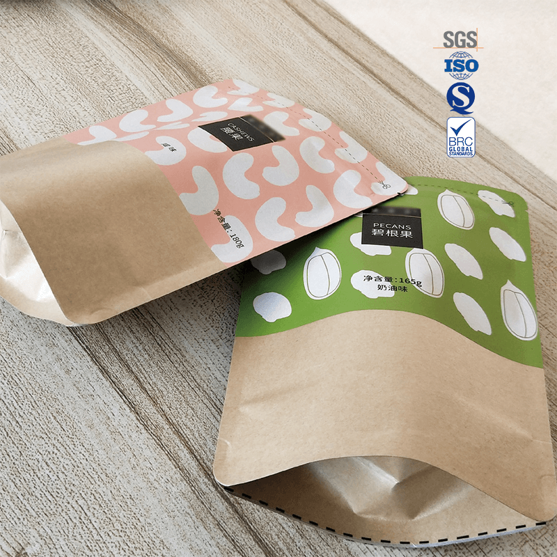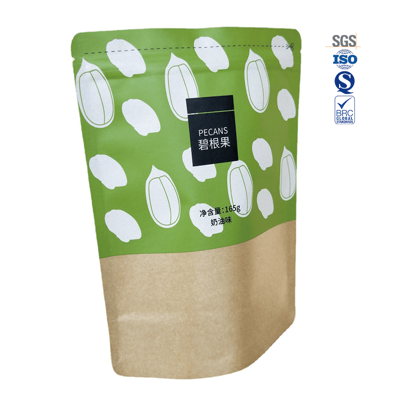 Kraft Paper Stand up food pouch with zipper has the characteristics of resealable zipper, recyclable, high barrier, moisture proof and smell proof etc. Perfect for cookies, candies, dried fruits, nuts, and various snack products, these pouches offer the ideal combination of protection, convenience, and visual impact.