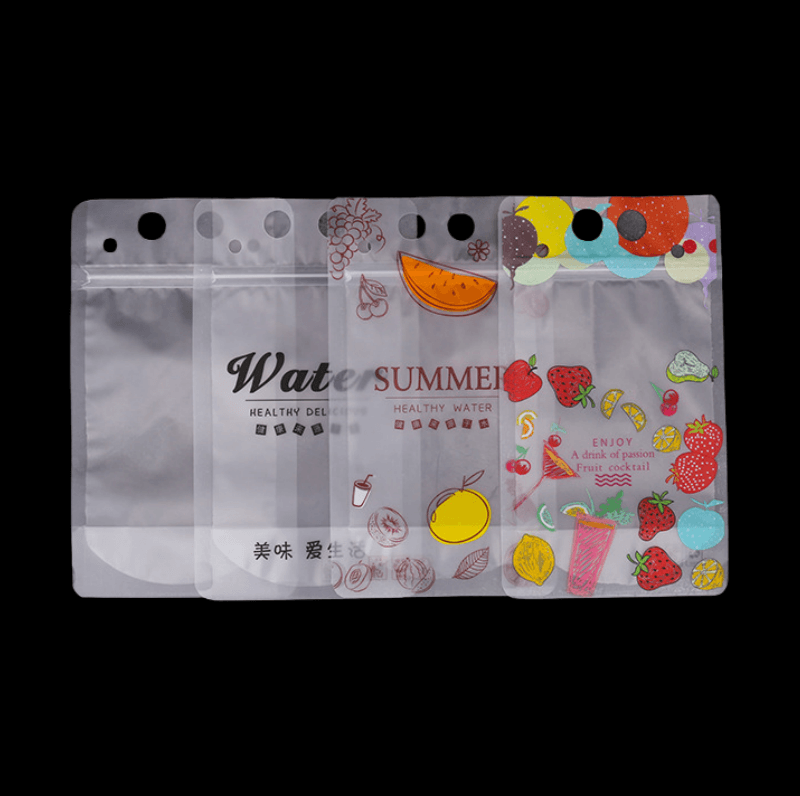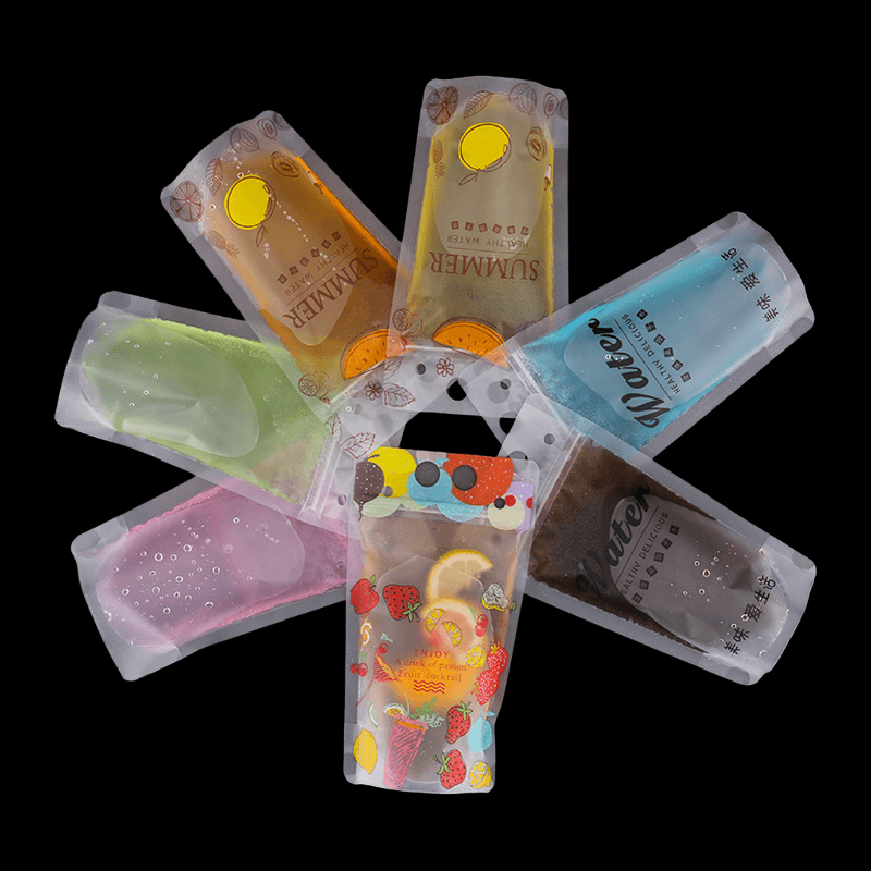 Our stand-up bags are crafted from food-grade frosted PE (Polyethylene) material that provides a sophisticated matte finish while maintaining product visibility and durability. The integrated handle ensures easy carrying and enhances user convenience, making it ideal for retail takeaway, events, and outdoor use. The pre-attached straw allows for immediate, hygienic drinking, and the leak-proof seal ensures secure containment during transport and storage. Our advanced printing technology enables vibrant, custom designs that stand out on the frosted surface, helping brands communicate quality and style while reinforcing consumer engagement.