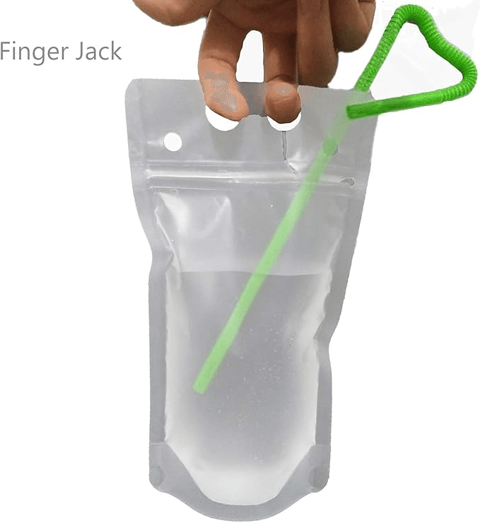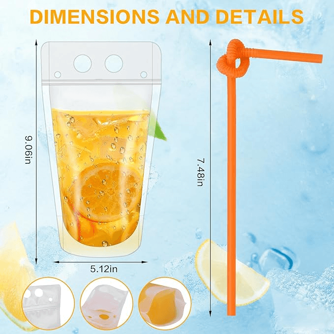 Custom reusable stand up pouches with handles and straw slots for beverages. Features ziplock closures, leak-proof PE material, and custom printing. Ideal for juice, tea, and party events. OEM support available.