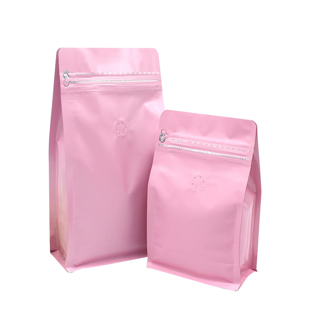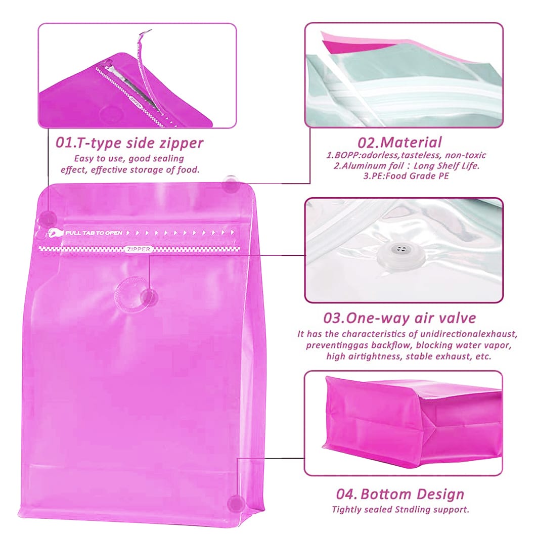 Our custom Flat Bottom Stand up Coffee Pouches. Engineered for excellence, these bags feature a robust eight-side seal structure that provides an unparalleled oxygen and moisture barrier, far superior to standard pouches. The integrated one-way degassing valve allows CO₂ to escape without letting air back in, protecting the freshness, aroma, and flavor of your premium roasted coffee. The sleek white resealable zipper ensures customer convenience and adds a touch of premium quality.